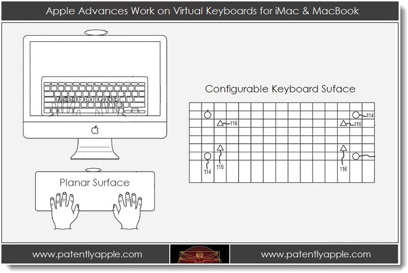 九月6日蘋果申請了麥金塔虛擬鍵盤的專利。所有的鍵盤都是可編程的(也就是都可是functional key)。所以將來蘋果可整合觸控面盤和鍵盤於麥金塔Mac和Macbook上!